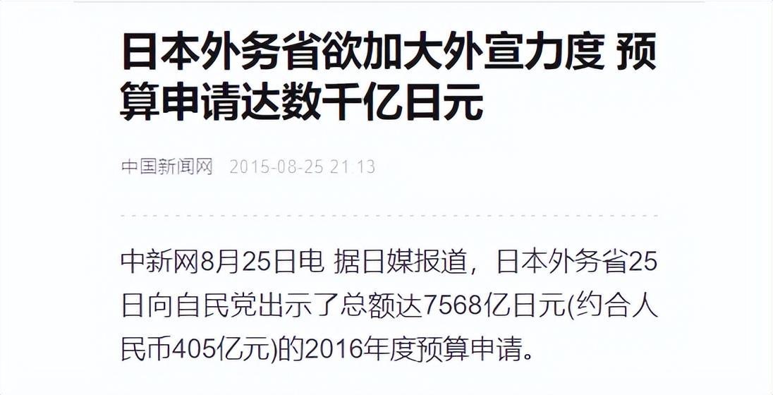 不僅如此,他們還花錢洗白自己。2015年,日本外務省的7568億日元(約合人民幣405億元)的年度預算申請通過,這筆經費,主要就是,向國際社會展示日本“正確姿態”,什麼是正確姿態呢,說白了就是洗白自己嗎,他們打算在海外推廣日語,推進青少年交流,以及在各國培養配合日本的知日派。