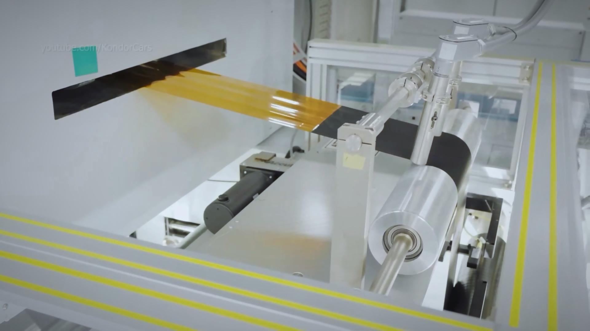 先把兩種不同的液體塗在碳纖維紙上,加熱乾燥後形成陰陽極材料。然後精確切割成設計形狀,粘合在一起形成聯合電極組件,成爲黑色的陽極片和陰極片,只是陰極片是光滑的,陽極片是啞光的。