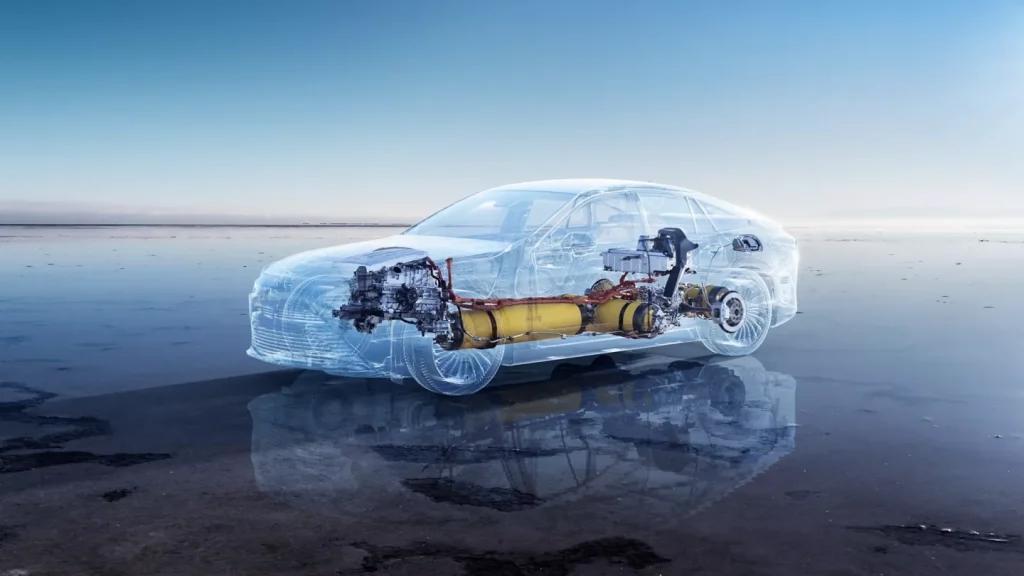 氫燃料電池並不是很多人想象中的燃燒氫推動內燃機工作,而是把氫氣和氧氣的化學能直接轉化成電能,剛好和電解水的反應相反。具體來說,氫氣在陽極被催化劑催化,質子穿過交換膜到達陰極,電子則經外部電路到達陰極,從而產生可用於驅動汽車的電流。