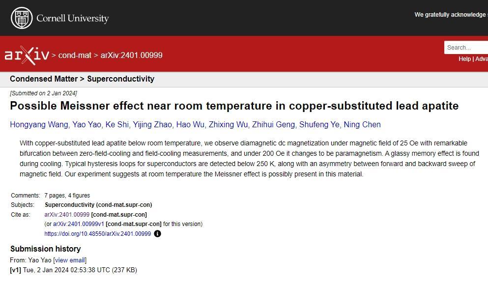 之後他們聯合在arXiv上發佈論文,明確在250K(-23℃)下檢測到了超導體典型的磁滯回線,認爲在室溫下可能存在邁斯納效應,300K以上仍有很大機會觀察到室溫超導性。只是樣品中信號還非常弱,需進一步合成更多樣品繼續驗證。