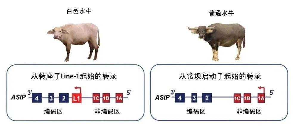 水牛ASIP基因上游插入了一個轉座子原件導致皮毛變白 (圖片來源:參考文獻5)