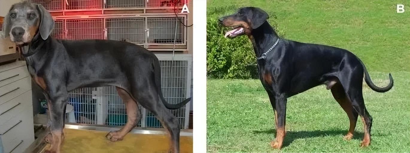 左邊爲毛色變淺的杜賓犬,常伴隨着脫毛症 (圖片來源:參考文獻7)