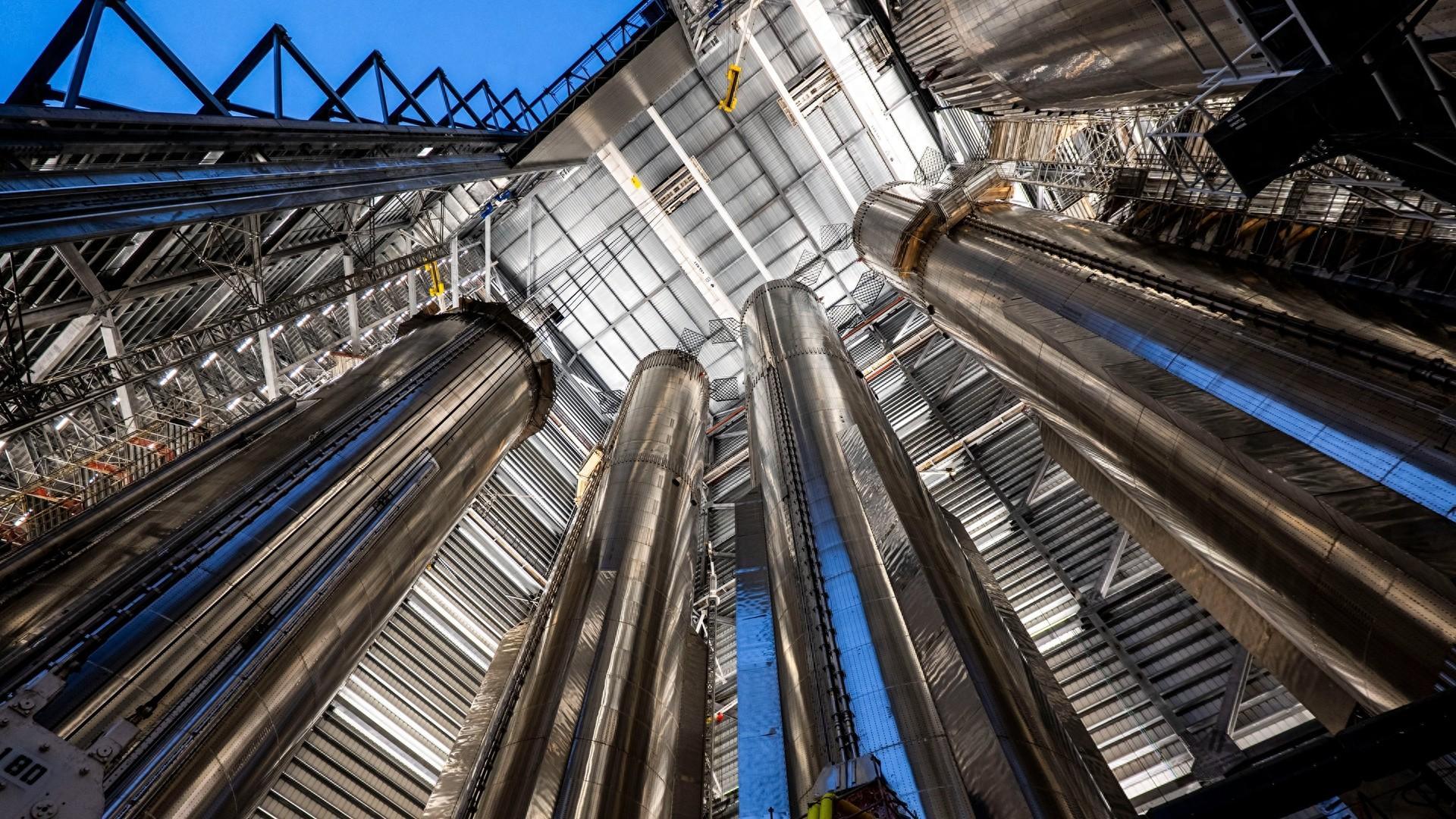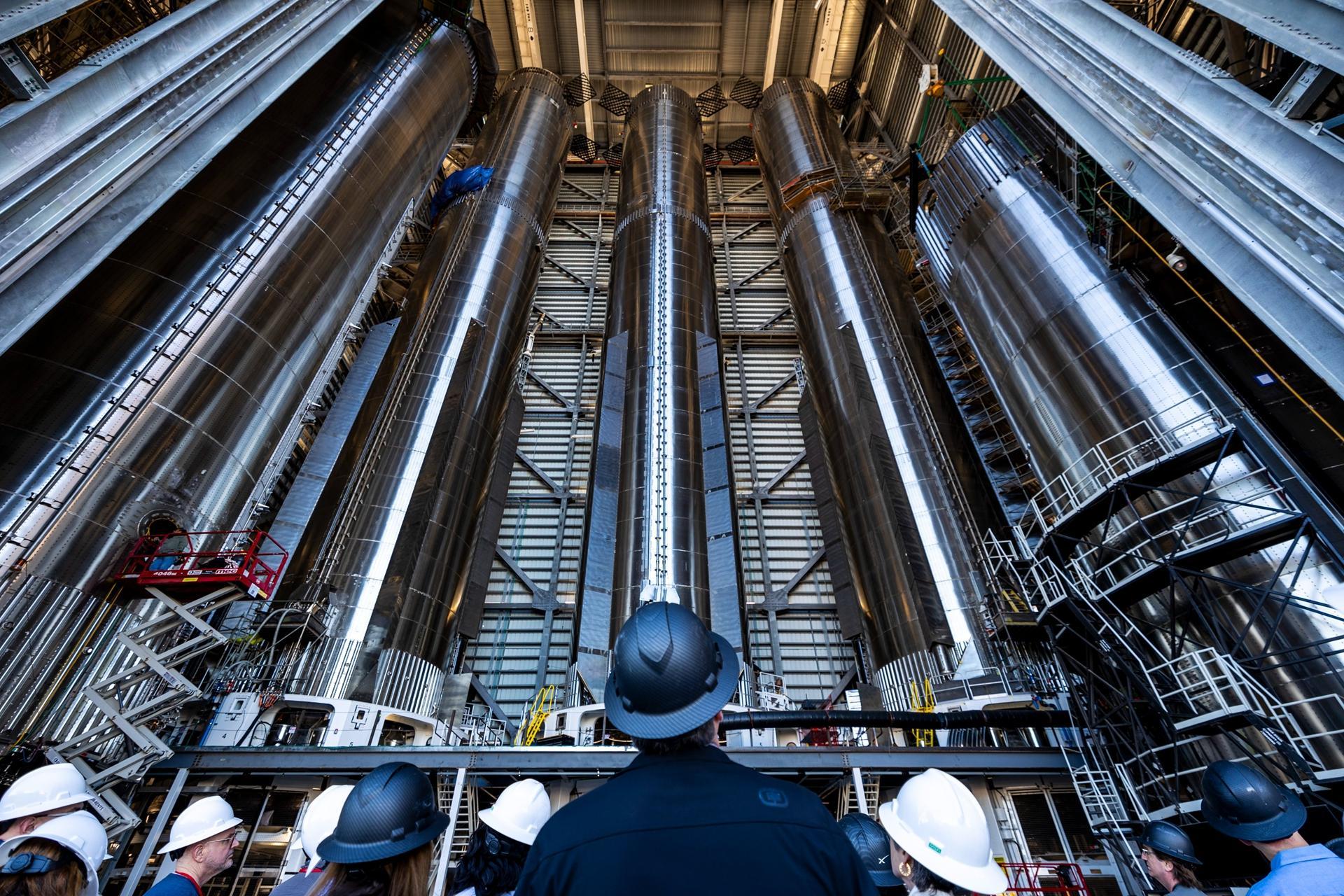 馬斯克到底有多瘋狂?你看看這4枚星艦超重助推器就明白了,赤裸裸的炫耀啊,都還沒有一次軌道發射成功,就一口氣造出了4枚70米高、直徑9米的火箭助推器,還密密麻麻擠在一座屋子裏,就像把4座24層高的筒子樓擺在屋子裏展覽一樣,簡直就是從人類視角來看上帝視角的龐然大物,這種毫不掩飾的炫耀估計也只有馬斯克能做得出來了。
