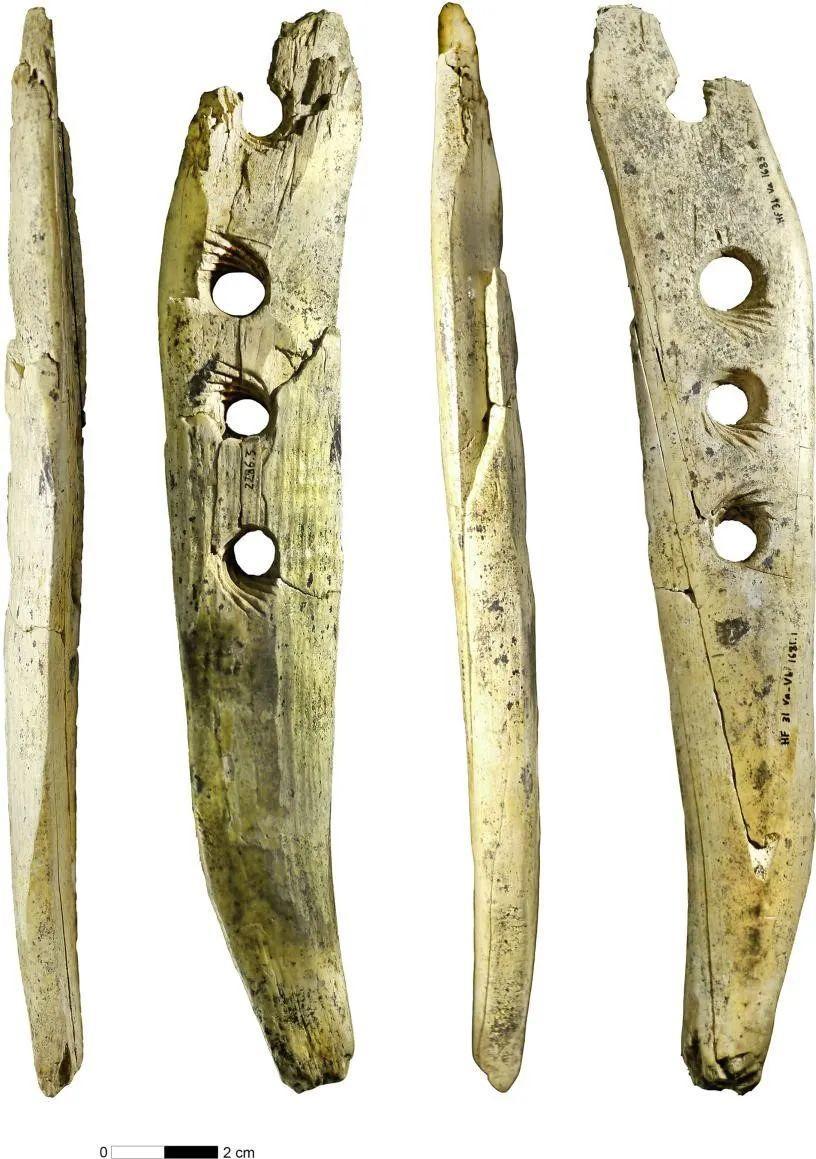 通過高倍顯微鏡和化學分析表明,這一文物上沾染了許多植物殘渣,並且它身上的微觀磨損的方向高度一致,可以推斷肯定是有很多植物從這幾個小孔的一側被拉到了另一側。