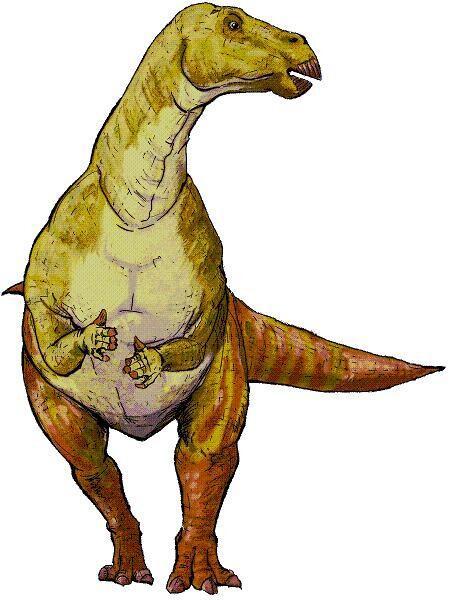 禽龍和人的對比圖,禽龍是比起鴨嘴龍超科更爲原始的一個類別,它具有較大的腕骨且保留了腕骨和第一指節(就是那個腿部鋒利的位置),也有人認爲諸葛南陽龍屬於禽龍類,(圖片來源:維基百科)