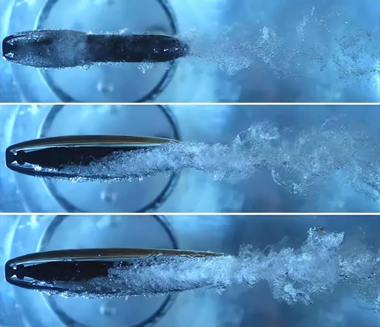 科學家們於是通過一個類似風洞的直徑30釐米的高速水道,用模型進行了測試,結果發現,通過調整氣體的釋放速度,可以緩解甚至消除這種脈動,但隨後就沒有再看到什麼新的研究結果了。我估計可能是所謂的超音速潛艇難度太大了,你想想看,一個多小時從水下穿越10000公里的太平洋,比超音速飛機還快,這要實現了用於商業運輸,那地球就成兩小時經濟圈了,這也太聳人聽聞了。