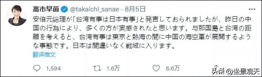 2022年8月5日,日本極右翼政客、自民黨政務調查會長高市早苗在社交平臺上發文,利用謠言炒作指責中國正常的導彈試驗“惡劣且危險”,同時借題發揮繼續炒作所謂的“臺灣有事就是日本有事”。