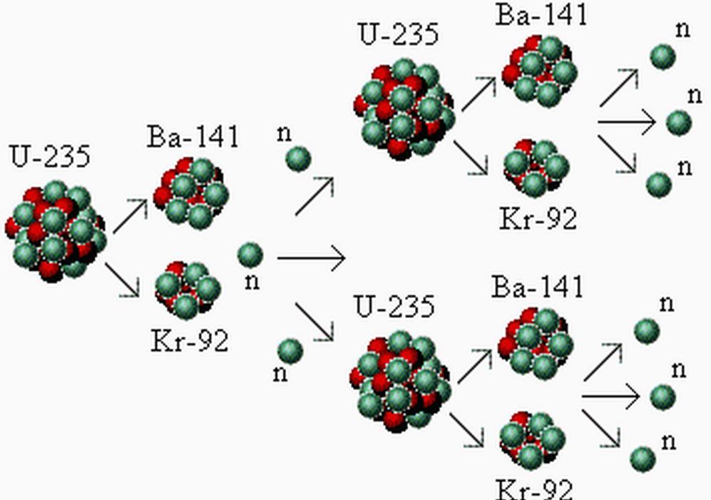 怎麼才能讓重原子裂變爲多個小原子呢?在覈電站的反應堆當中,通常會使用熱中子去轟擊鈾-235的原子,然後產生2到4箇中子,中子再去轟擊其他鈾-235原子,然後循環往復,形成鏈式反應。
