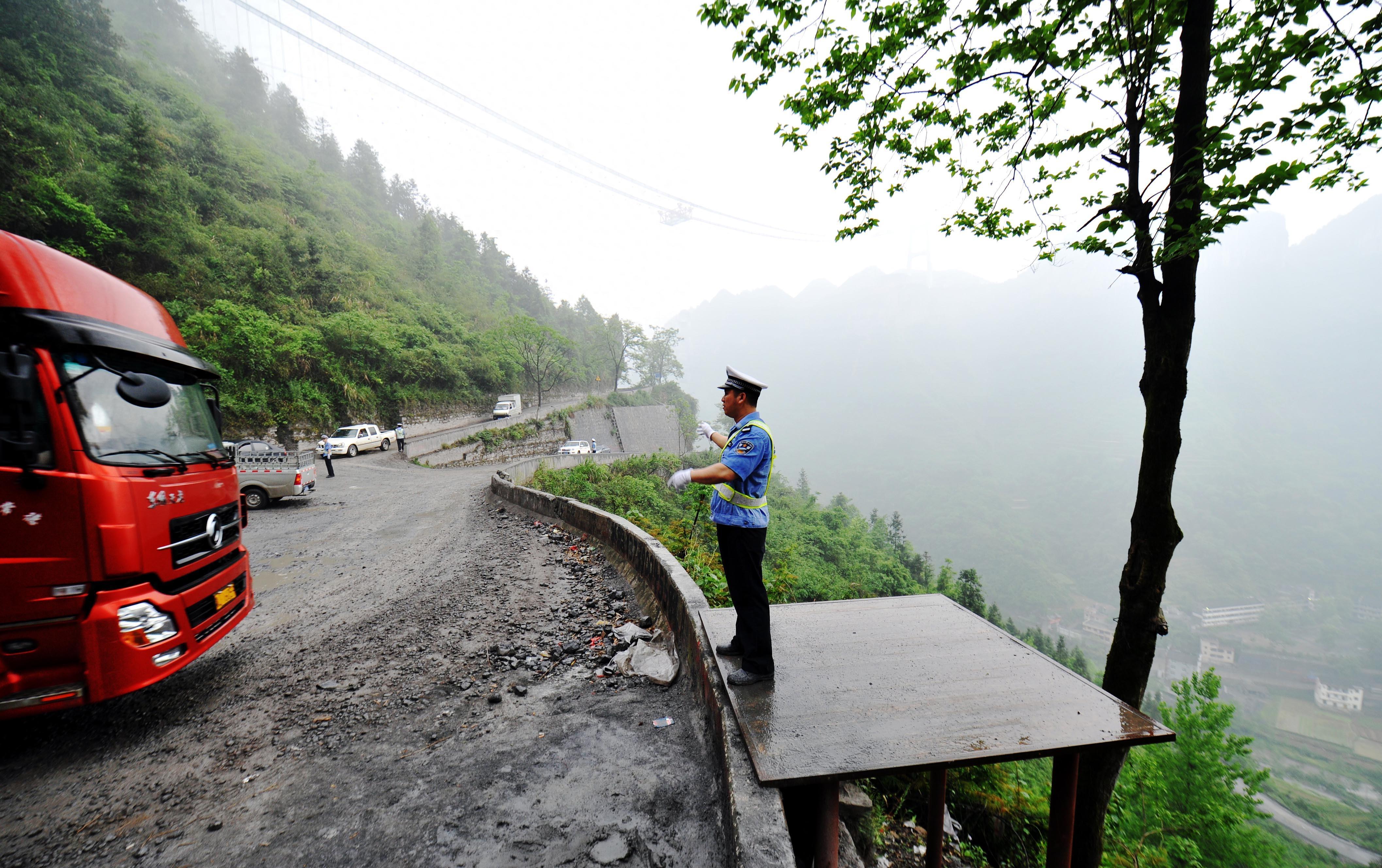 這就是湘川最著名的雲中崗亭!2007年,吉茶高速公路樞紐工程矮寨大橋開始動工,當時矮寨盤山公路是施工車輛通行的唯一道路,爲了給施工車輛“保駕護航!爲了給司機騰出更多的道路空間!這裏值班的交警用木棍木板,靠山依樹搭建了空中崗亭!剛好被一位網友給拍了下來,於是最牛交警誕生!矮寨盤山公路雖僅僅6公里,