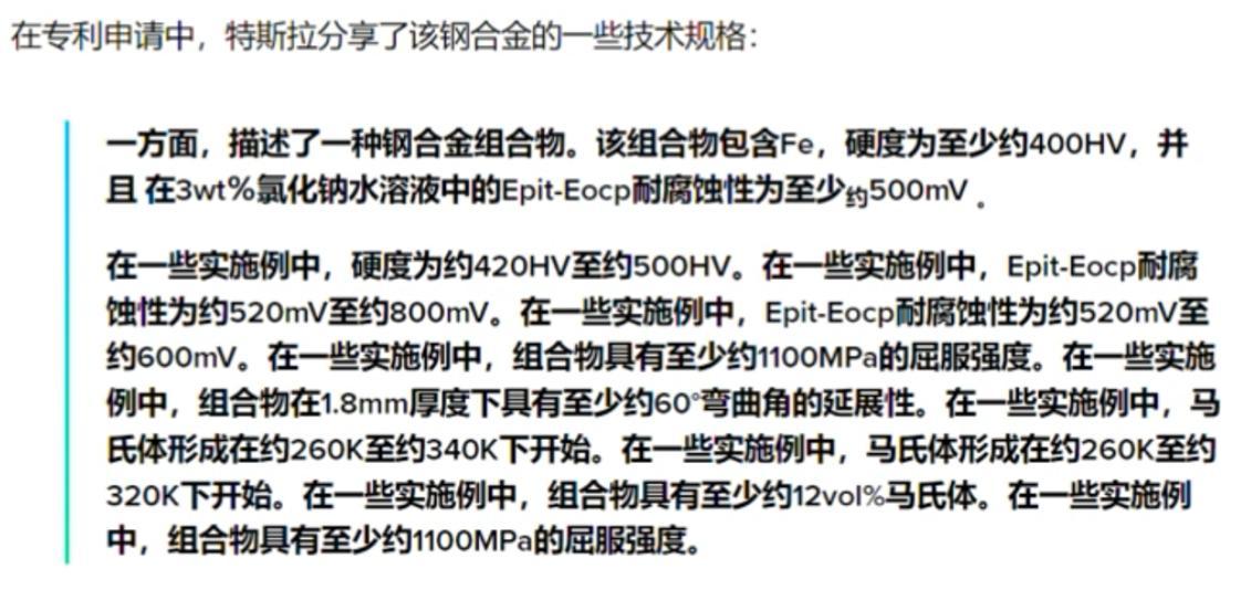300不鏽鋼含有鉻和鎳,鎳和鋼會形成奧氏體微觀結構,具有良好的高低溫韌性、延展性、強度、耐腐蝕性以及經濟性。而特斯拉專利申請中提到,30X不鏽鋼含有至少12%的馬氏體成分,估計是爲了提高它的強度和硬度,特斯拉稱其性能超過了其他合金。那麼它的性能究竟有多好呢?
