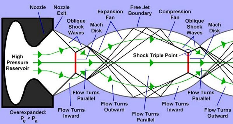 由於噴口是圓形,另一邊的氣體也會形成同樣的激波,於是會合在一起,波峯波谷疊加成爲菱形,也就是激波形成的流場。隨着局部密度和壓力的突然變化,流場會變得我們肉眼可見,也就是噴嘴後一連串的鑽石形震波。