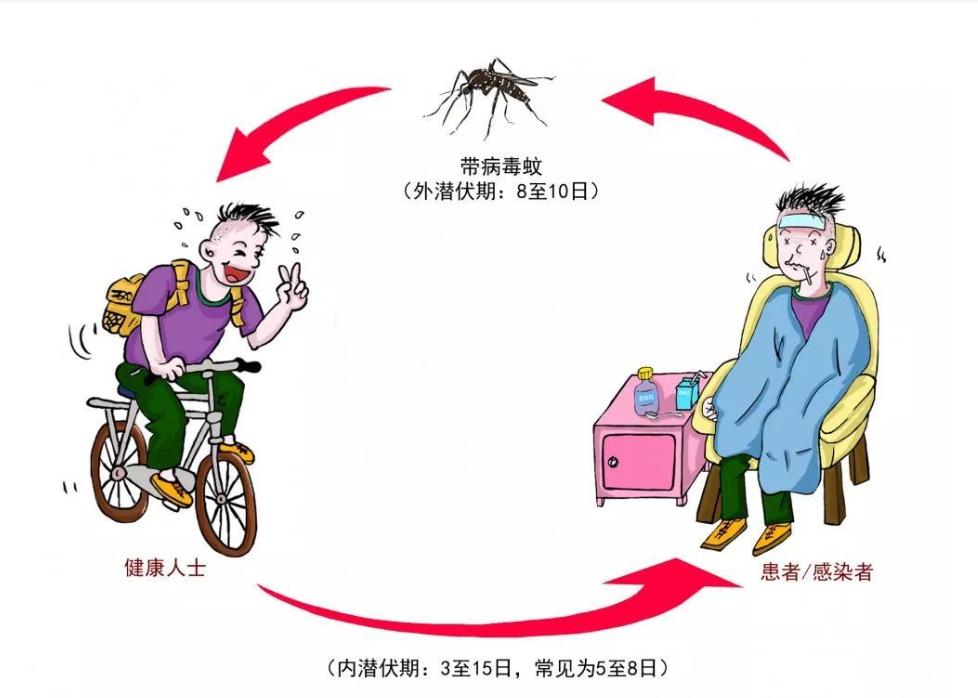 一般來說,白紋伊蚊在叮咬帶有病毒的人和猴之後,會有10天左右的潛伏期,再叮咬下一個人就會傳播病毒,而白紋伊蚊則可以永久攜帶這些病毒。