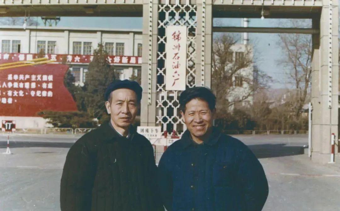 1983年,順丁橡膠工業化生產成功後,周望嶽(右)和張國棟在錦州六廠大門前合影。周望嶽供圖