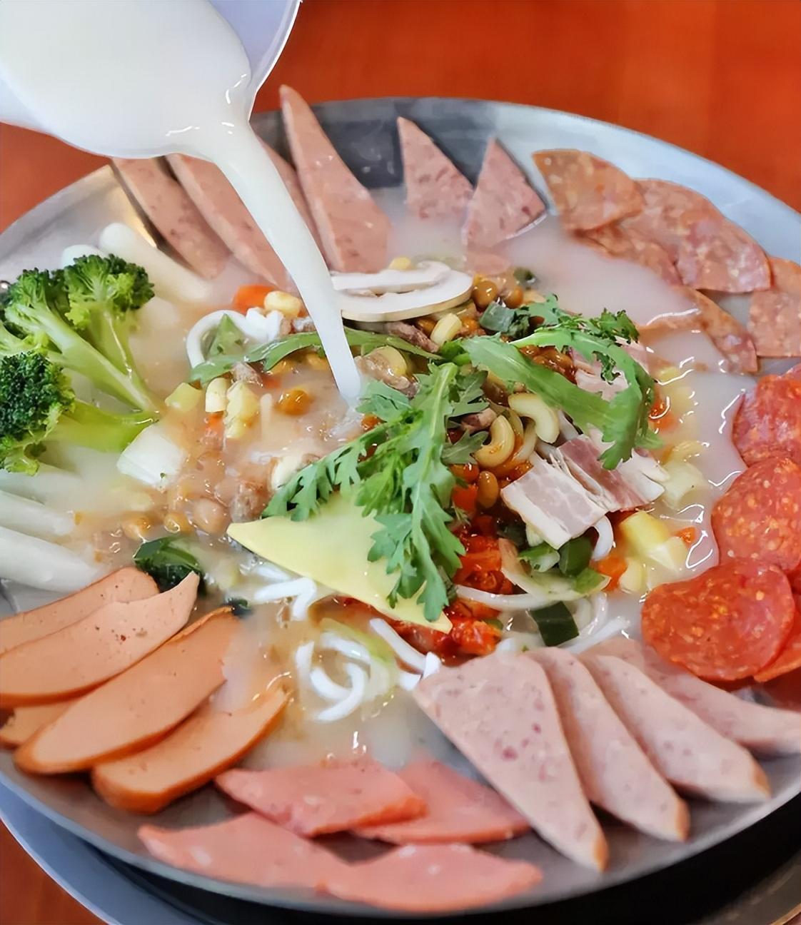 由於戰爭導致物資短缺,美軍基地內剩餘的香腸、罐裝火腿和午餐肉、奶酪等食材,被附近居民拿來搭配辛辣的苦椒醬作湯底,煮成一鍋湯, 0元開盲盒,美軍剩啥我喫啥,正式因爲美軍部隊的過度浪費,泔水,不,是剩菜纔會出現在韓國家庭的餐桌,拿回家一加熱,放點辣白菜壓下個別異味,就是一鍋好菜!因爲是從美軍部隊撿來的東西,所以就叫部隊鍋。因爲發現了這種美味,美軍剩菜一度成了緊俏貨,0元開盲盒,