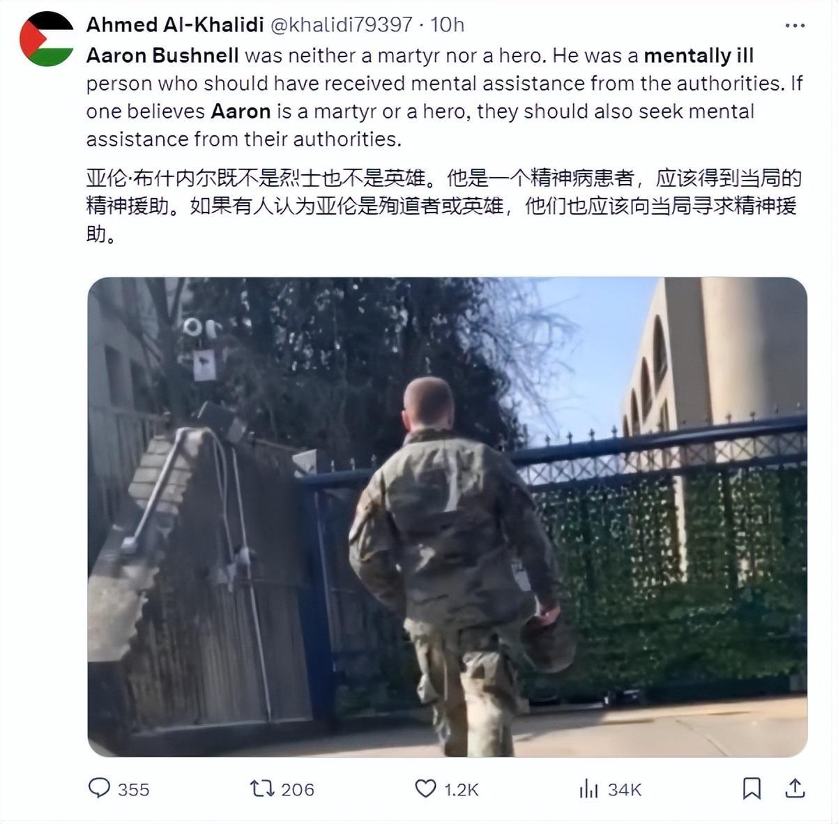 美國男子自焚抗議以色列,偉大國際主義戰士亞倫·布什內爾,在以色列大使館門口自焚,臨終遺言是:解放巴勒斯坦,毫無疑問,亞倫·布什內爾,的自焚,在美國又掀起了新一輪的反以高潮,但是你知道嗎,美國正在試圖把他塑造成“精神病”。