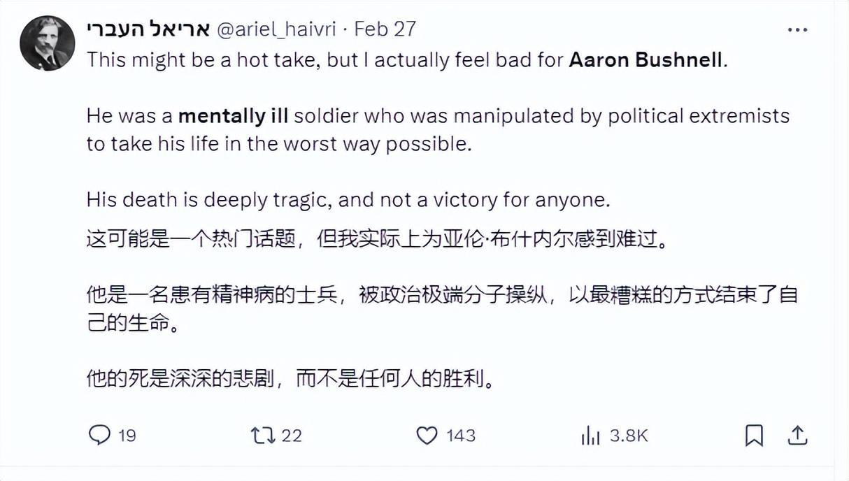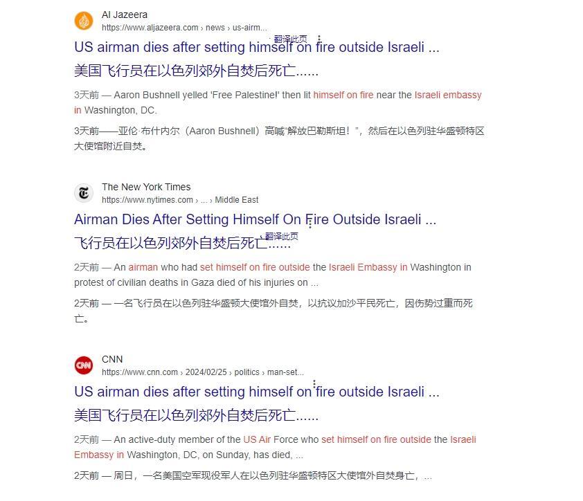 這一點,我覺得真的是毫無疑問的,他用他的生命,在爲一羣飽受壓迫的巴勒斯坦人發聲,還是以如此極端的方式,你要知道,自焚啊,得多疼啊,但是他都沒有猶豫一下,臨終的時候也不是求救,而是喊着“解放巴勒斯坦”。