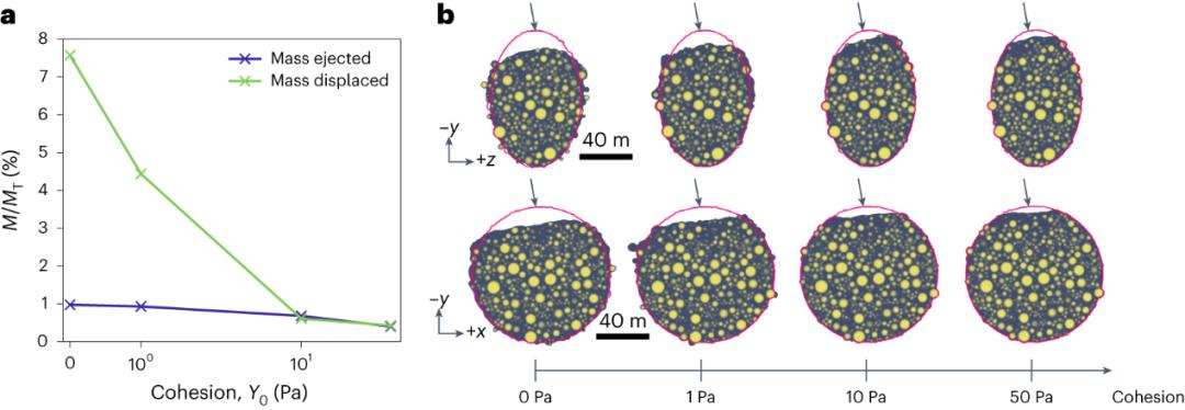 如果小行星的內聚力完全消失,變得如同乾燥的沙子一般,那麼撞擊方向的表面可能會被“推平”高達20%。這意味着這顆原本形如“鴨蛋”的小行星,在撞擊後將變爲一個“平頭”,其原有的“造型”被徹底破壞。