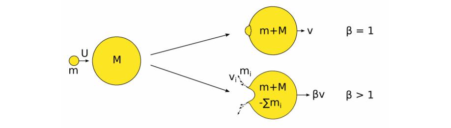 【撞擊體與小行星完全融合,不產生任何濺射物,則動量傳遞因子爲1;撞擊產生濺射物,類似火箭“噴射”物質獲得加速,爲小行星帶來撞擊之外的額外動量,則動量傳遞因子>1】