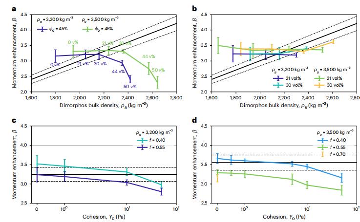 圖5 動量傳遞因子約束了小行星的密度不超過2400 kg/m3並且內聚強度極低 (圖片來源:Nature Astronomy)