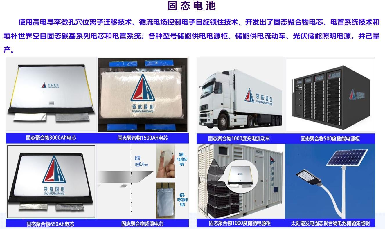 而領航國創的固態電池,2021年有報道稱,是全球單體容量最大的固態聚合物鋰離子電池,單片重量約10公斤,容量超過500安時,最高容量可達3600安時,主要用於軍工產品、重型卡車、新能源旅遊大巴車、電力行業的儲能設備等,是傳統鋰電池的兩倍,並且通過了國家權威機構在高速撞擊、強力擠壓、火燒、海水浸泡等極端條件下的測試,安全性極高。該公司稱傳統鋰電池大巴車充電一次可跑300-400公里,而領航國創的固態電池則可以跑將近1000公里,續航能力是傳統鋰電池的2.5-3倍。