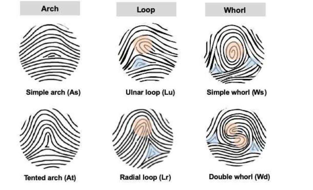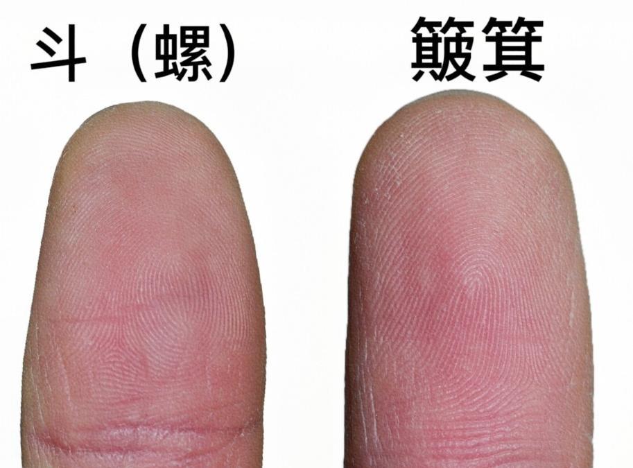分別爲弓型(arch)、環型(loop)和渦旋型(whorl),其中後兩者對應的分別是我們俗稱的“簸箕”型和“鬥”型。