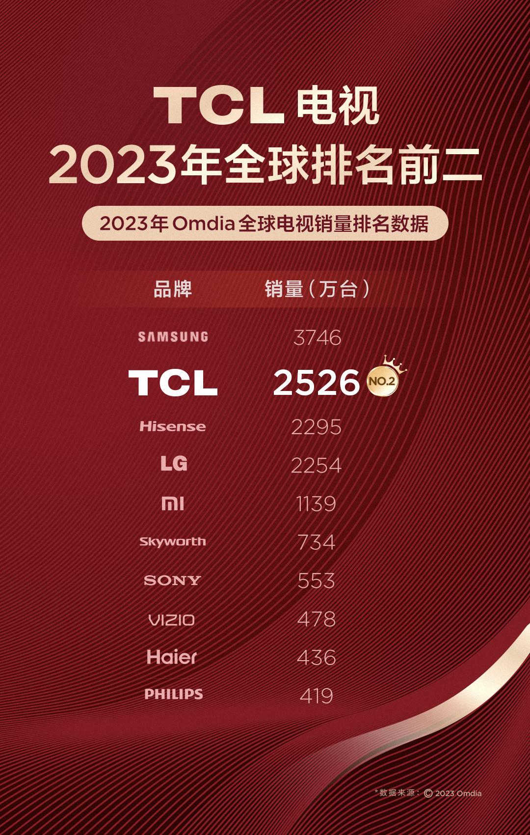 此外值得一提的是,不久前全球知名市場監測機構Omdia公佈了2023年全球電視銷量排名數據。其中TCL以2526萬臺的銷量,排名全球品牌第二,中國民族品牌第一。