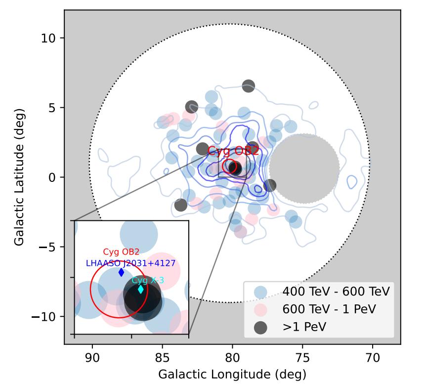 且慢,下面纔是劇情的高潮:拉索團隊經過一年多的物理分析,考慮多方面的因素,各種理論計算,這個泡泡的內部結構跟天鵝座的獨特星團、星際塵及氣體雲的複雜結構密切相關。而且在這個千光年直徑的泡泡中心定位出一個數十光年大小的區域,認證這個有數十顆大質量恆星的天鵝座星協OB2,在源源不斷地發射出超高能宇宙線,他們稱之爲:“超級宇宙線加速器”,並且做了多方面計算演練,看看什麼條件下能加速出億億電子伏這麼高能量的宇宙線。