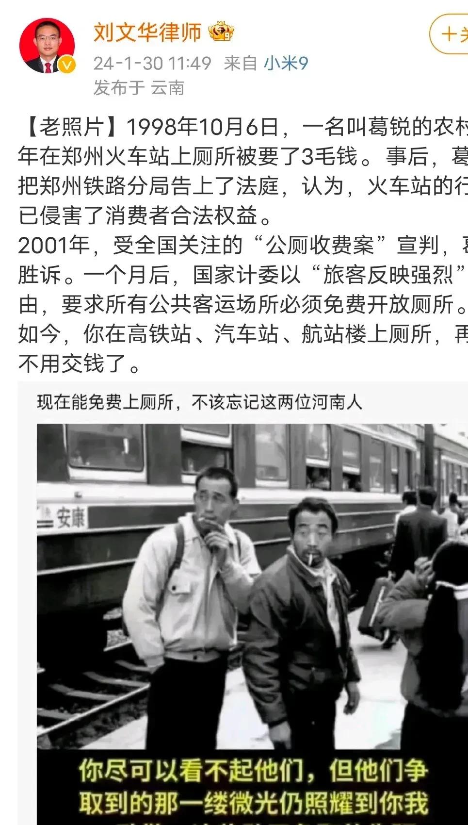 他爭取的權利惠及了每位遊子!1998年10月6日一名叫葛銳的農村青年在鄭州火車站上廁所,被要了3毛錢。 80後肯定深有同感,出門在外的人上過很多收費公廁!當時人們的月薪才520!