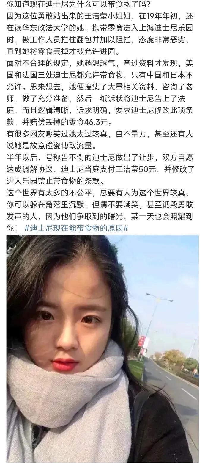 訴求簡單,半年後當庭和解,賠償了50元!迪士尼也宣佈禁止攜帶食物進園這款條例無效!如果說中國人免費上廁所,要感謝葛大哥,那現在迪士尼可以大搖大擺帶食物進園,全靠小王同學!這個世界有太多不公總要有人爲此較真!但凡園區食物溢價不高!