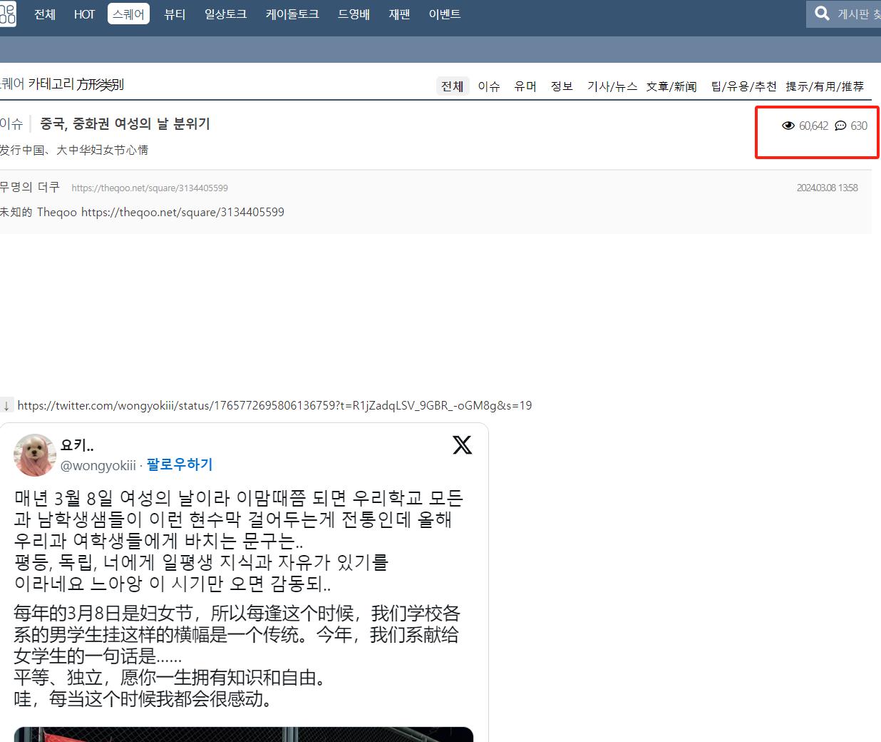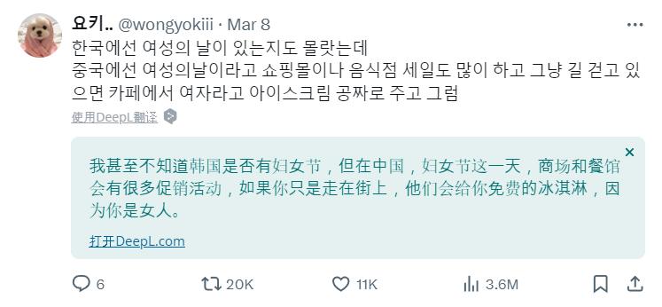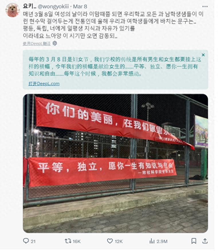 這件事是這樣的,在中國留學的韓國留學生,在X上發佈了條中國婦女節的帖子,說的。