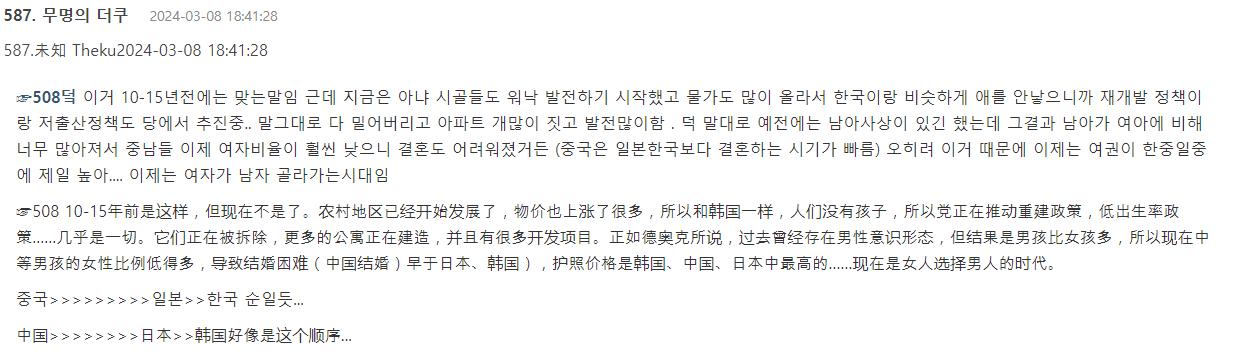 不少人同意他的看法,比如,這一條,女性地位,中國遠遠高於日本,日本僅僅高於韓國。