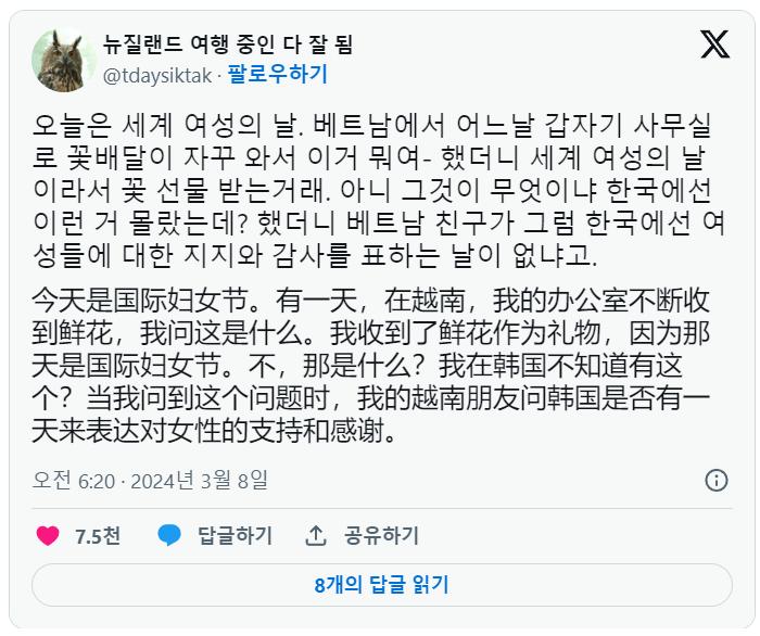 還有一個在越南的韓國人,也在X上表示,因爲在辦公室裏,收到了花,才知道3月8日是國際婦女節。