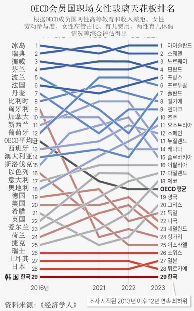 日本,韓國確實是爛兄爛弟,有人甚至貼了一張女性職場玻璃天花板的圖,這張圖可以一定程度上反映一個國家的女性地位,其中韓國常年倒數第一,日本幾乎位於倒數第二。但這不是最搞笑的,1996年,韓國加入經合組織,連續26年都保持第一,估計未來依然會保持。而在韓國加入之前,保持第一的是日本。