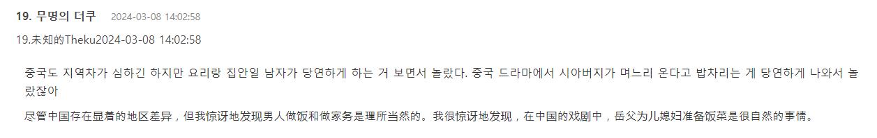 甚至還有人說,在中國的電視劇中,公公給兒媳婦準備飯菜,讓她感到十分驚訝。不過仔細一想,在韓劇裏,確實也沒見過公公做飯的。