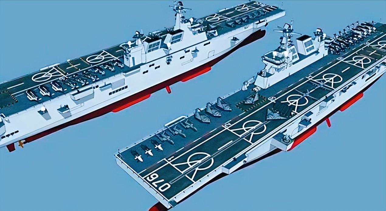 此前網絡上都在傳說076兩棲攻擊艦的排水量,在075船型4萬噸的基礎上,還有所提升,而且有人大膽猜測,認爲076兩棲攻擊艦的排水量,將會達到6萬噸級,這有望堪比中型航母的體積,可想而知戰力增強也是不遑多讓,成爲新型航母的補充力量。