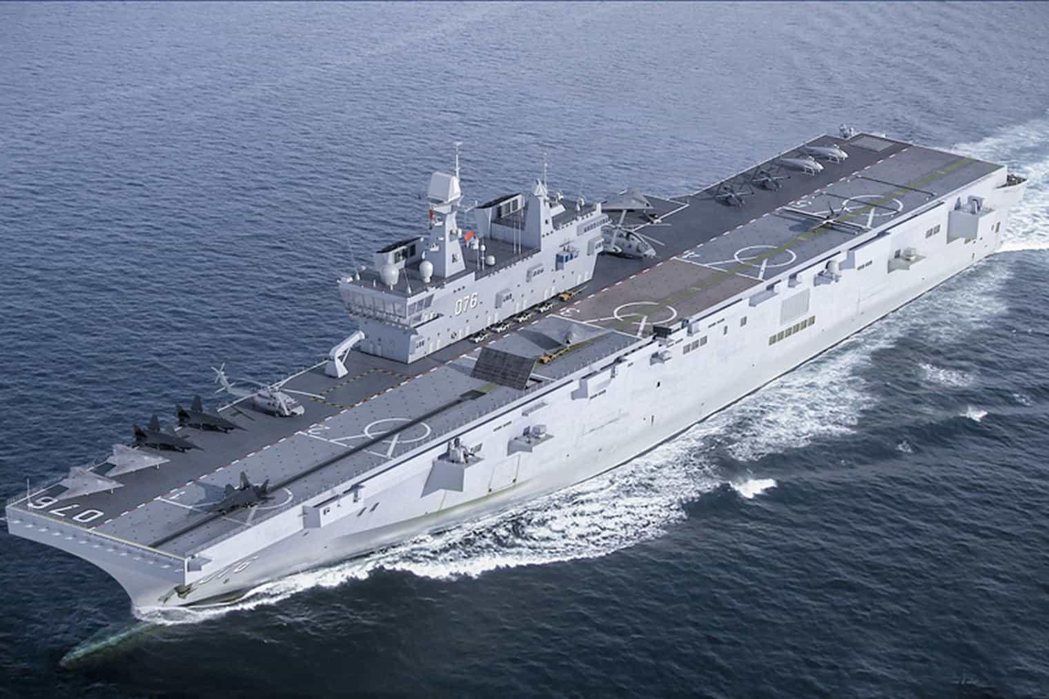 076兩棲攻擊艦將會最少達到排水量5萬噸級,有着火力密集的1130近防炮設備,還有着“紅旗”-10防空導彈,殲35摺疊翼戰機等作戰裝備。