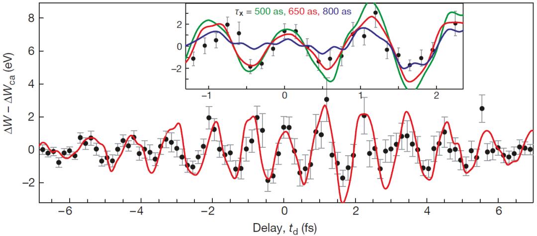 Ferenc Krausz等測量的孤立阿秒脈衝,其中黑色點爲實驗測量結果,紅色線爲假設脈衝寬度爲650 as的模擬計算結果,插圖中的綠線、紅線、藍線分別是假設脈衝寬度爲500 as、650 as、800a s時的模擬計算結果(引自Hentschel, Michael, et al. Attosecond metrology. Nature 414.6863 (2001): 509-513.)