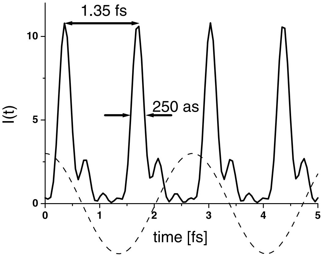 Agostini等用RABBITT法測出的阿秒脈衝序列,每個峯的半高寬是250 as,間隔是1.35 fs,餘弦函數波形(虛線)代表零延遲時紅外探測場(引自Paul, Pierre-Marie, et al. Observation of a train of attosecond pulses from high harmonic generation. Science 292.5522 (2001): 1689-1692.)