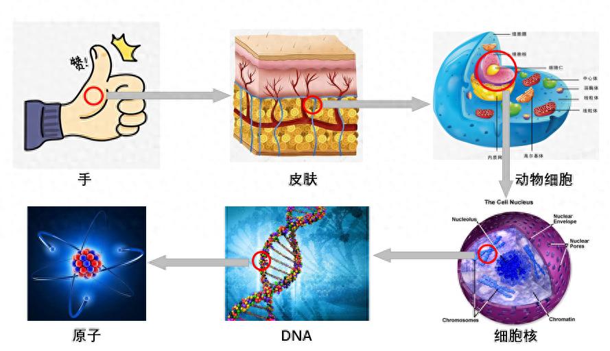 即使挑戰如此巨大,科學家們依然在不停努力,試圖建造出更加精密的設備來觀察原子和電子的運動。之所以這麼做,是因爲所有宏觀物質都是由微觀粒子構成,當我們用顯微鏡把人體的一個部位不斷放大後將會看到下圖展示的圖像: