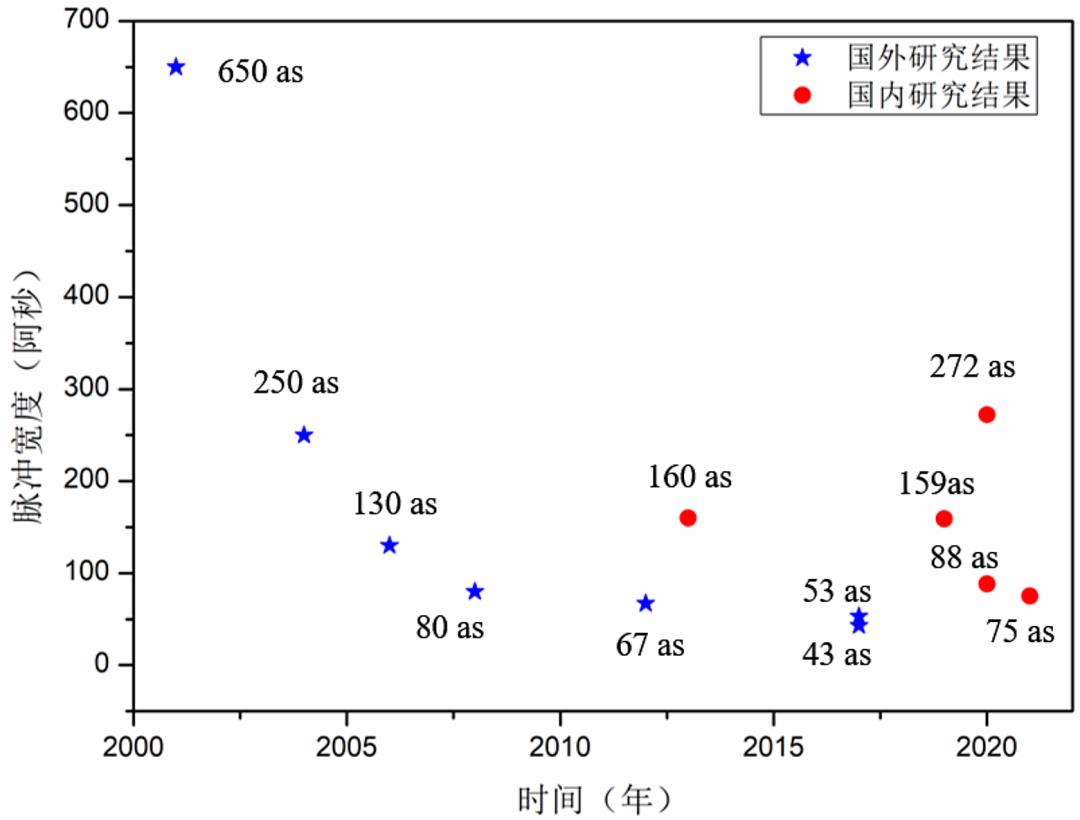 阿秒脈衝的脈寬變化(引自王虎山,曹華保,皮良文,等. 阿秒脈衝產生和測量技術研究進展(特邀). 光子學報,2021,50(1):0132001)