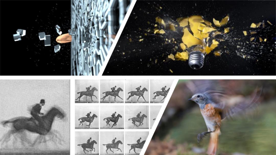 子彈擊穿玻璃的瞬間(引自Veer圖庫),燈泡爆裂的瞬間(引自Veer圖庫),人眼觀察的與高速相機拍攝的疾馳的駿馬(引自維基百科The Horse in Motion),小鳥飛行時高速振動的翅膀(引自Veer圖庫)