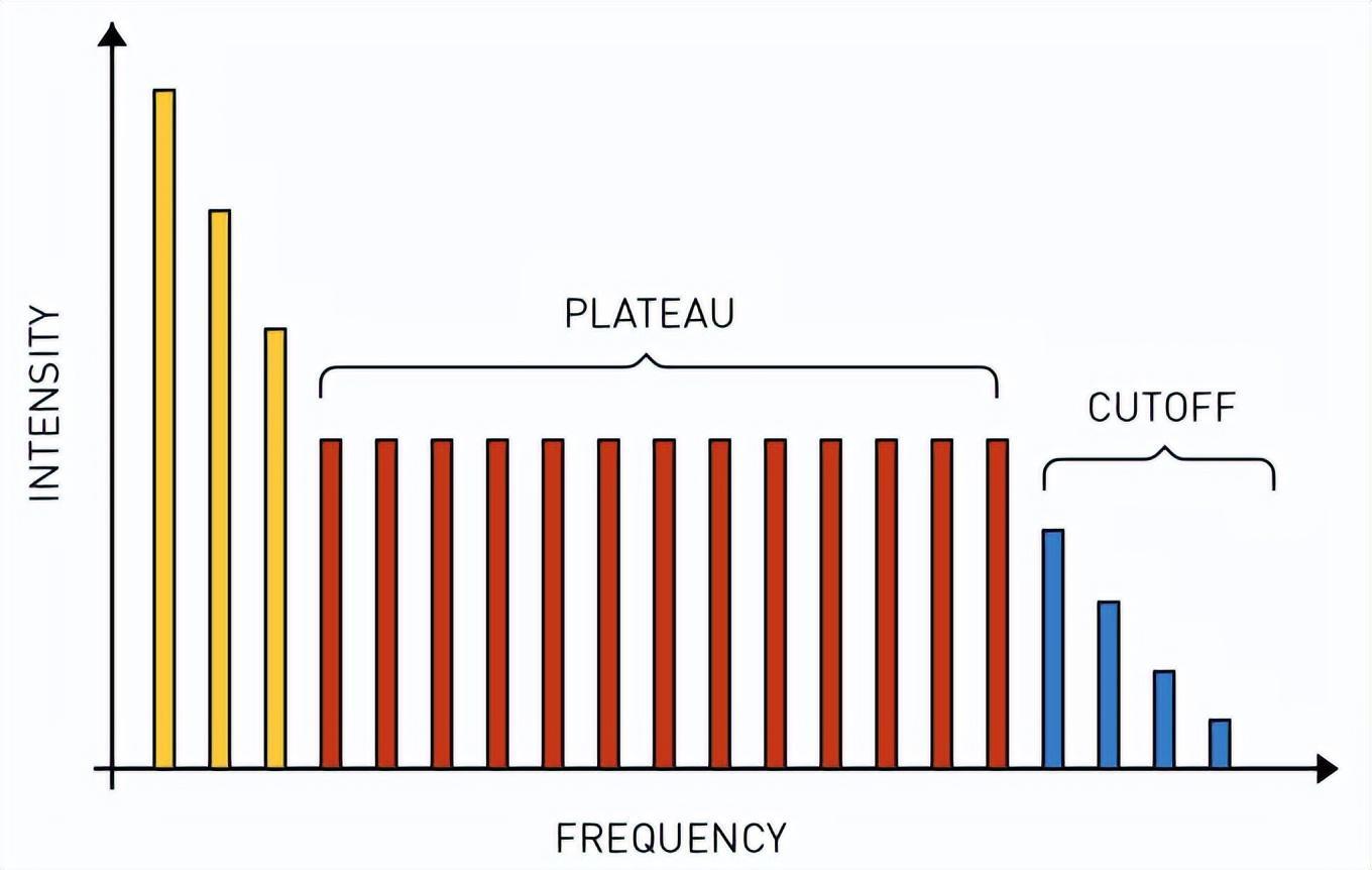高次諧波的頻率結構,分爲微擾區(黃色部分)、平臺區(紅色部分)與截止區(藍色部分)
