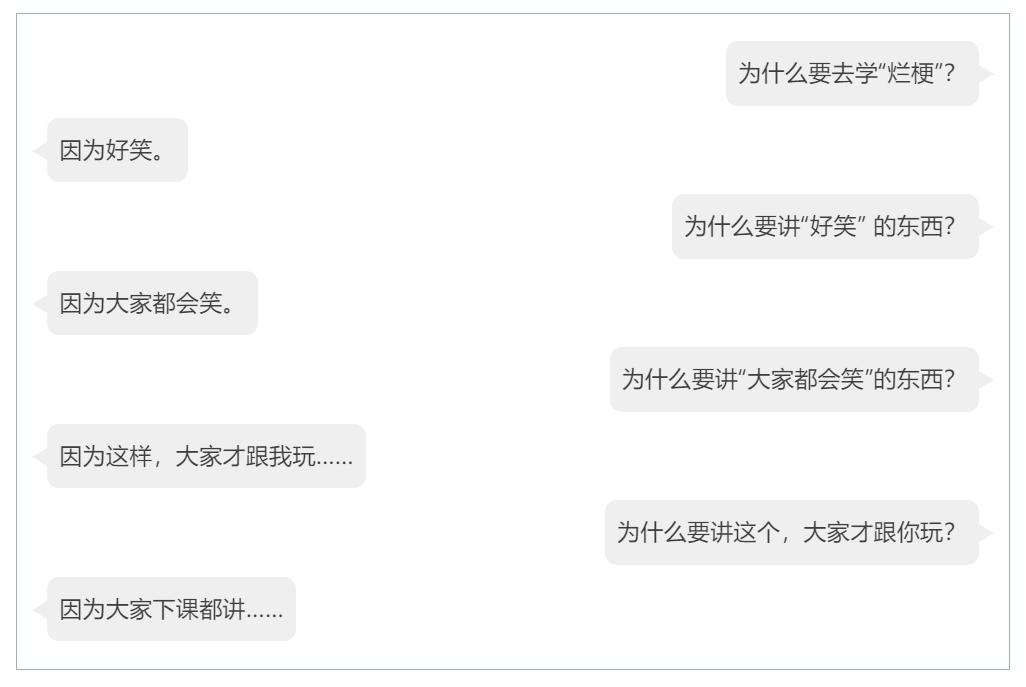 “孩子講爛梗”主要指是兒童不分場合使用和傳播梗的行爲,簡單來說,這相當於“說話不得體”(徐娜娜,2023)。互聯網上的無聊笑話怎麼會成爲兒童羣體中的潮流?孩子們知道自己在說什麼嗎?