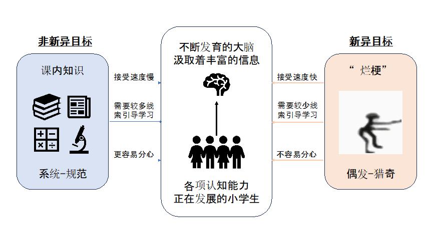 如圖所示,與學生們系統的學習各種課內知識不同,突然出現的“爛梗”可能會作爲新異刺激,引發學生的好奇,投入大量的注意和認知資源在其中進行學習。