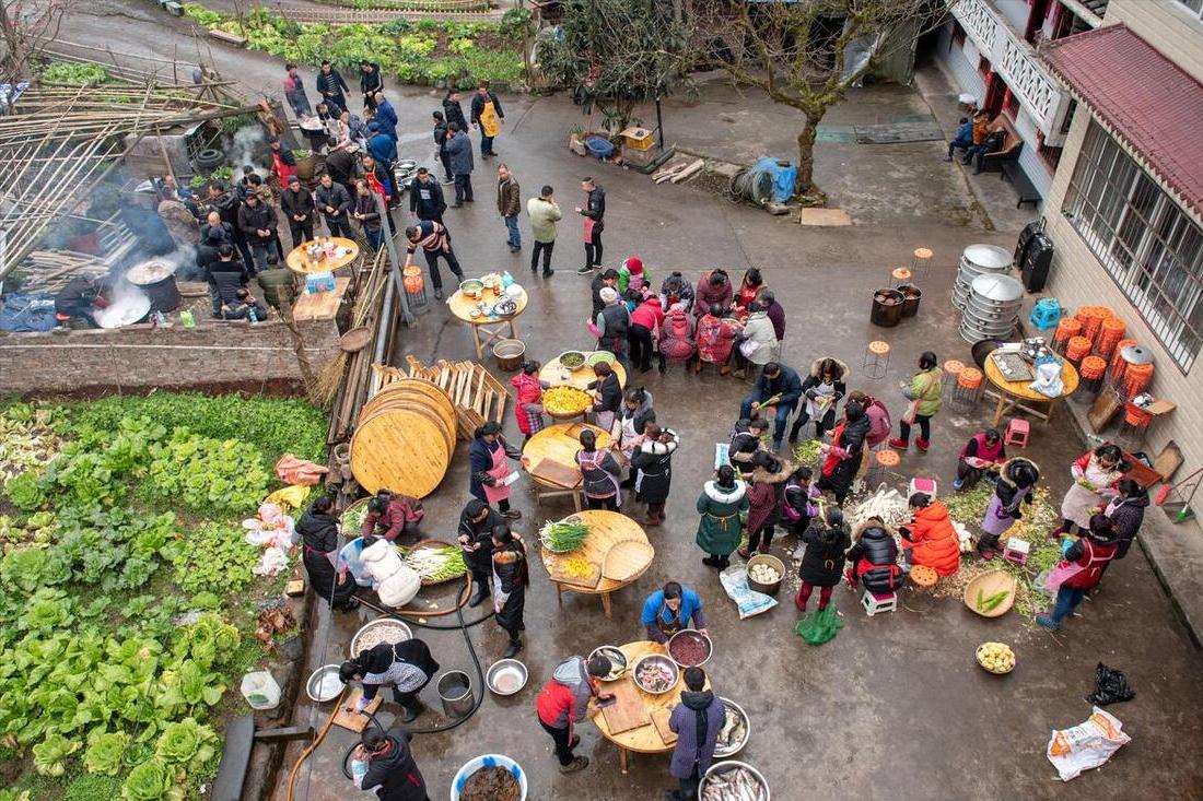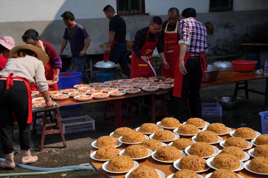 鄉下街道陽光暖,流水席中品味香。沉浸耳聽嗩吶語。村邊竈火廚正忙。