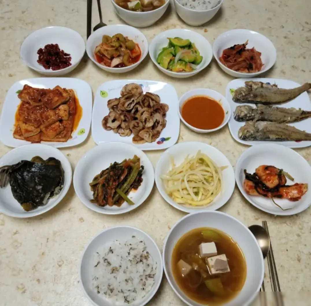 盯着滿桌不知如何下口!擺滿了各種菜品,有牛肉湯、年糕、小雜菜、泡菜、八爪魚等,看似滿漢全席!仔細一看海底撈小料臺都比桌上豐富,