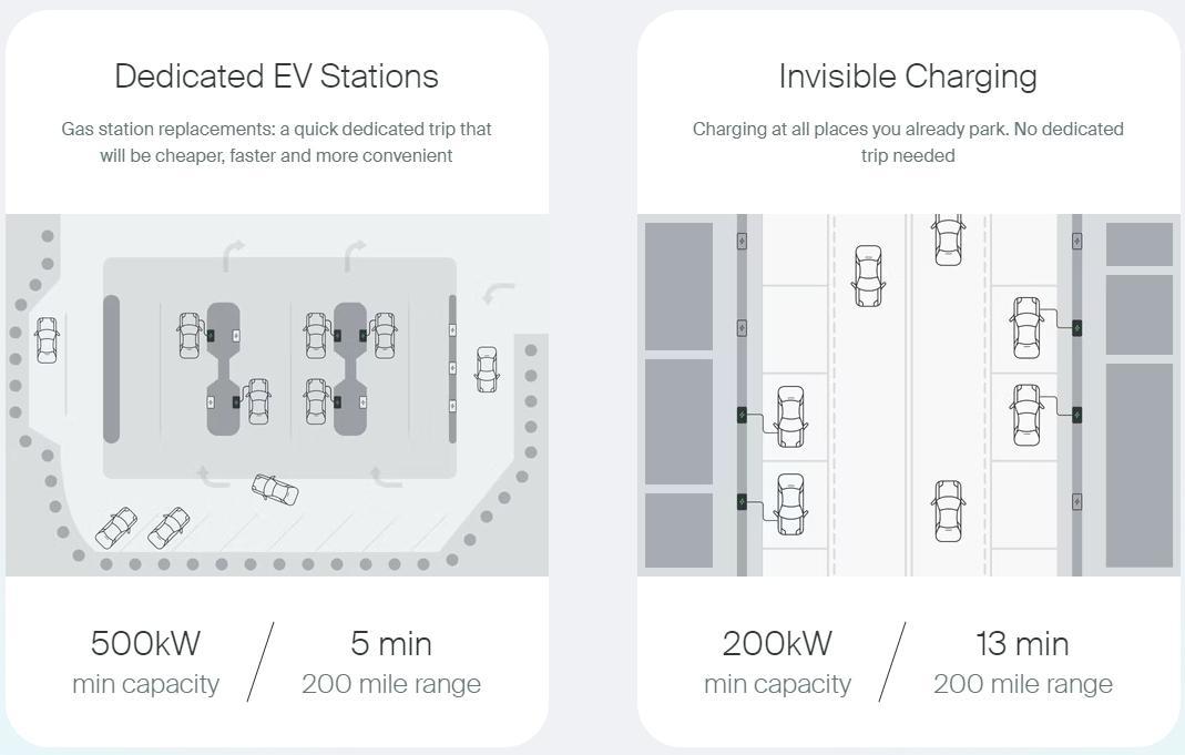 然而500千瓦的充電樁,在美國實際並沒有什麼用處,因爲充電是雙方你情我願的事情,你有500千瓦的充電樁,還得有500千瓦的電動汽車來充,但美國現在的現實世界還沒有電動汽車,能夠真正以350千瓦以上的功率充電,所以更多的時候,Gravity的服務是200千瓦,充電13分鐘,續航320公里,當然,這也是夠快了。