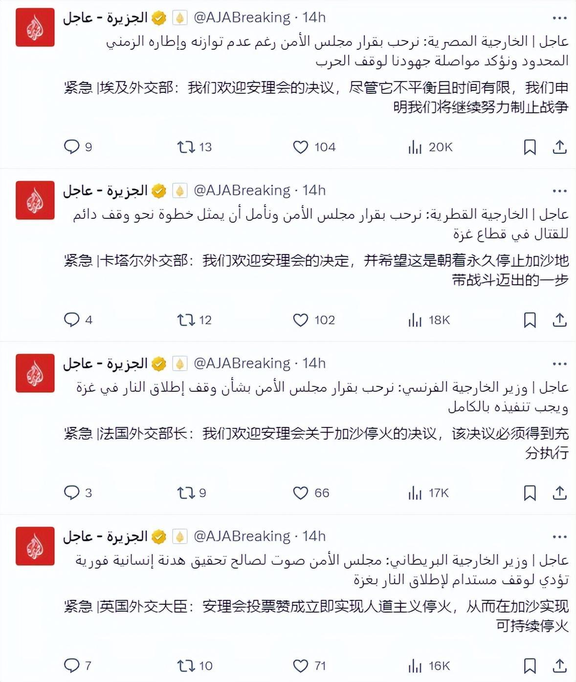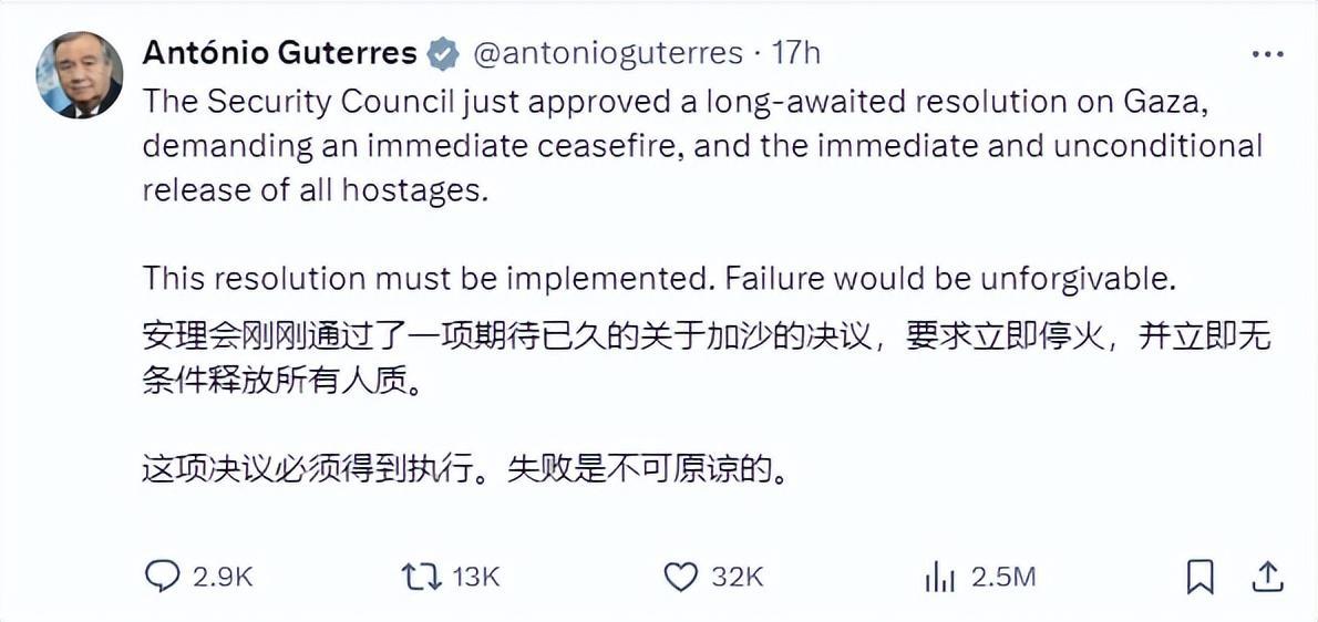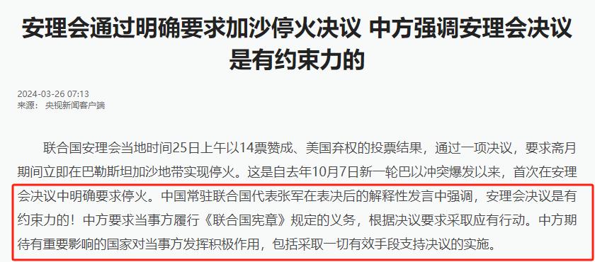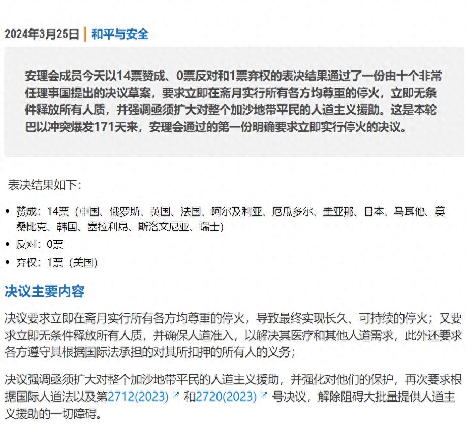 這個決議對於被奪去生命的32000多無辜平民來說,來得太遲了。正義雖然會遲到,但終將勝利。經過幾個月的努力,聯合國安理會終於通過了一項決議,要求加沙齋月停火。這次是14票贊成,1票棄權,這次燈塔國終於不投那該死的否決票,而是投棄權票,全場出現難得的掌聲,真是天下苦美久矣。