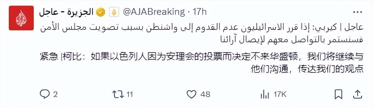 看到決議通過,以色列第果然取消了代表團訪問華盛頓。國家安全委員會戰略溝通協調員柯比表示,我知道以色列很着急,但我比你更着急。