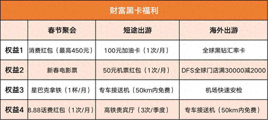 就算你春節準備出國玩兩圈,也能薅一把,它不僅有全球黑鑽匯率卡,DFS滿30000減2000的權益,同時還能享受機場快速安檢、專車接送,以及機票紅包,這麼一算,又能省一大筆。